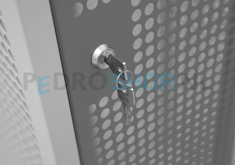 Standaard wordt de kast geleverd met een cilinderslot inclusief twee sleutels. De binnenliggende scharnieren zorgen voor een strakke afwerking en maken het mogelijk om de deuren tot 90 graden te openen. Onder het legbord zijn vier stevige kunststof kledinghaken aangebracht, ideaal voor het ophangen van jassen, tassen of accessoires.