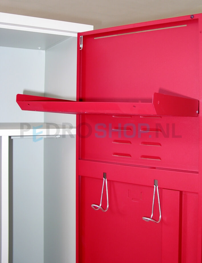 De kast is vervaardigd uit een sterke gelaste staalconstructie en afgewerkt met een krasvaste structuur poedercoating. De ombouw is uitgevoerd in lichtgrijs RAL7035 en de deuren in rood RAL3003, wat zorgt voor een herkenbare en professionele uitstraling. In elke kolom bevindt zich een hoedenplank, een kledingstang met haken en een verdeelschot zodat schone en vuile kleding of werk- en privékleding apart bewaard kunnen worden.
