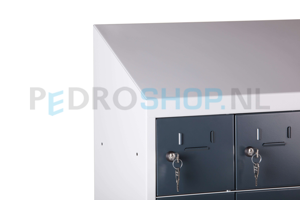 De SQ classic mini kantine locker met gladde deuren en schuin dak. Voorzien van koppelgaten voor een zijdelingse en ruglingsekoppeling. Deze kantine mini locker kent voor de deuren de kleurcode: Antraciet Ral 7016 en voor de ombouw: Lichtgrijs Ral 7035.
