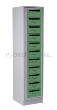 Deze postvakkenkast biedt ruimte voor het opbergen van poststukken en enkele eigendommen. De postvakkenkast kent 1 kolom, deze kolom is voorzien van 11 postvakken. Deze postvakkenkast kent voor de deuren de kleurcode: Groen Ral 6011 en voor de ombouw: Lichtgrijs Ral 7035.