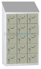 Met een afmeting van h109 x b62 x d30 cm biedt de kast voldoende ruimte voor 15 mini lockers, verdeeld over 3 kolommen met ieder 5 lockers. Elke locker heeft een afmeting van h16 x b15 x d27 cm.