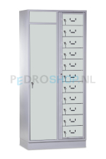 De SQ combinatie kledingdistributie- wasopvangkast met 11 deuren. Deze kast is een slimme combinatie van twee functies in één compacte behuizing. Links een apart vak voor het verzamelen van vuile was, rechts een kledinguitgiftesysteem met 11 individuele vakken. Praktisch, hygiënisch en ruimtebesparend.
