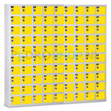 De afmetingen van de lockerkast zijn: h153*b165*d20 cm. De afmeting per mini locker is: h11,8*b12,6*d11,7 cm. De locker kent voor de deuren de kleurcode: Geel Ral 1023 en voor de ombouw: Lichtgrijs Ral 7035.